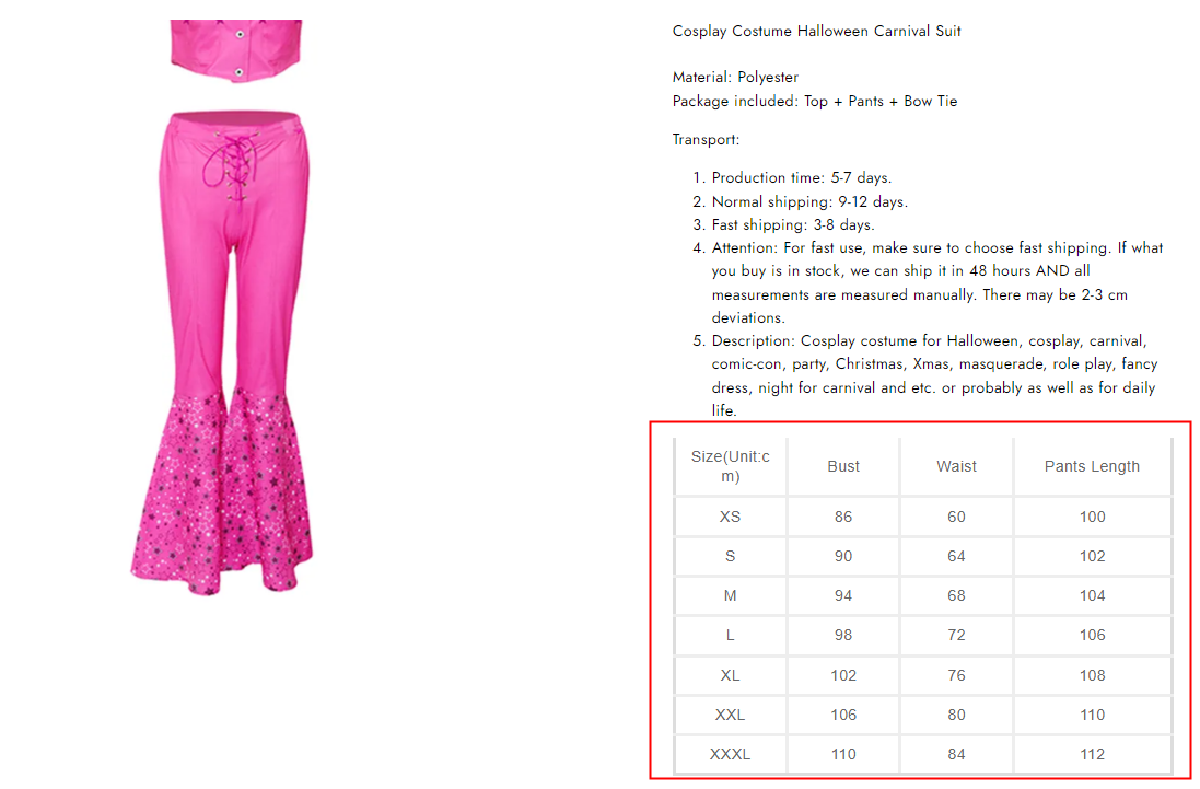 The detail of the Size Chart: